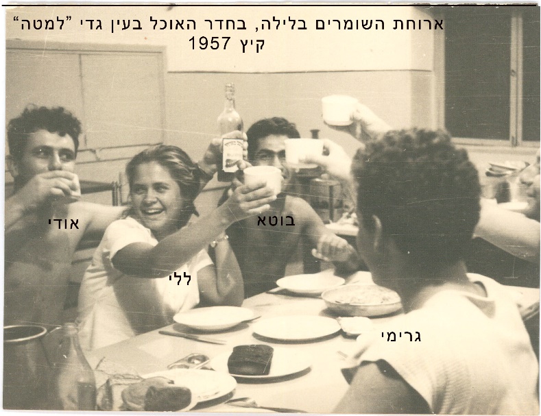 עם הצרופה: ארוחת השומרים בלילה, בחדר האוכל בעין גדי "למטה", קיץ 1957. לפני 69 שנים. אהוד האופה בן 21.